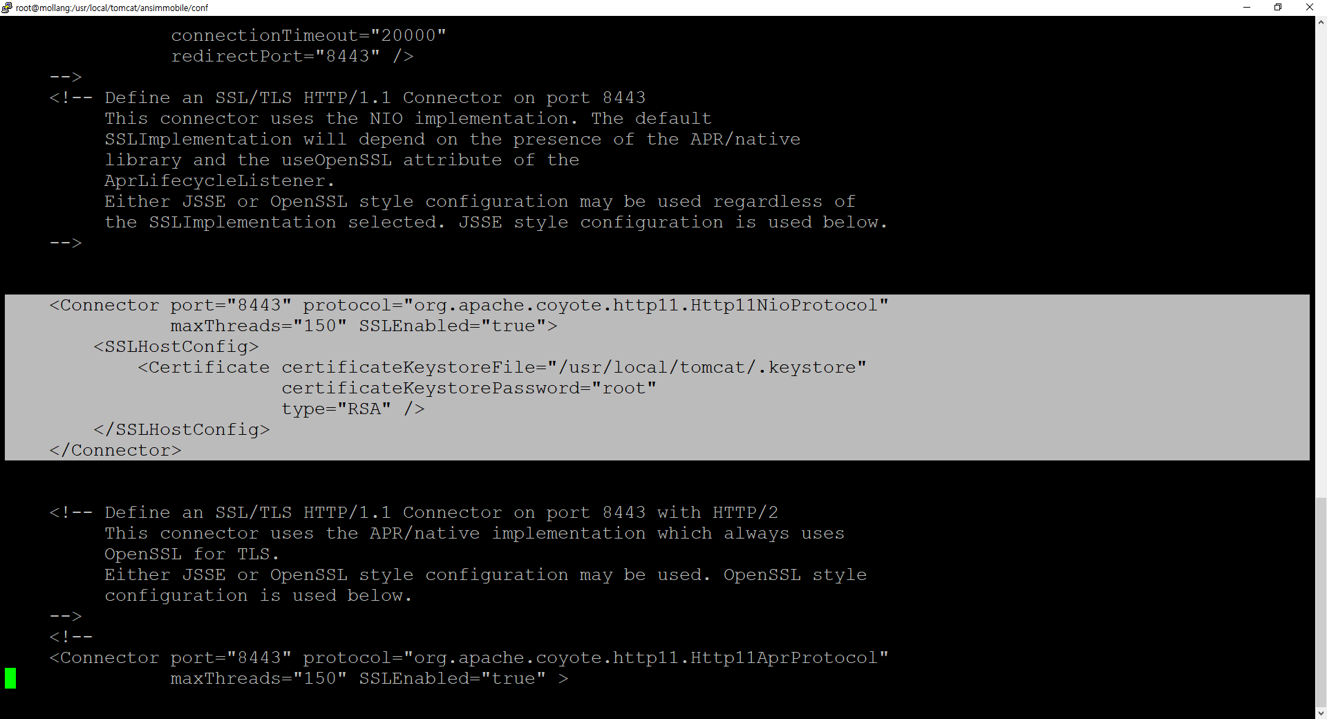 여기서 유심히 살펴볼 부분은 port와 certificateKeystoreFile입니다.