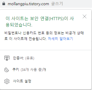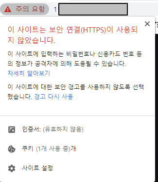 기본적으로 https 적용 시 이 문구가 뜨면서 정상적인 웹 접속이 힘든 상태입니다.